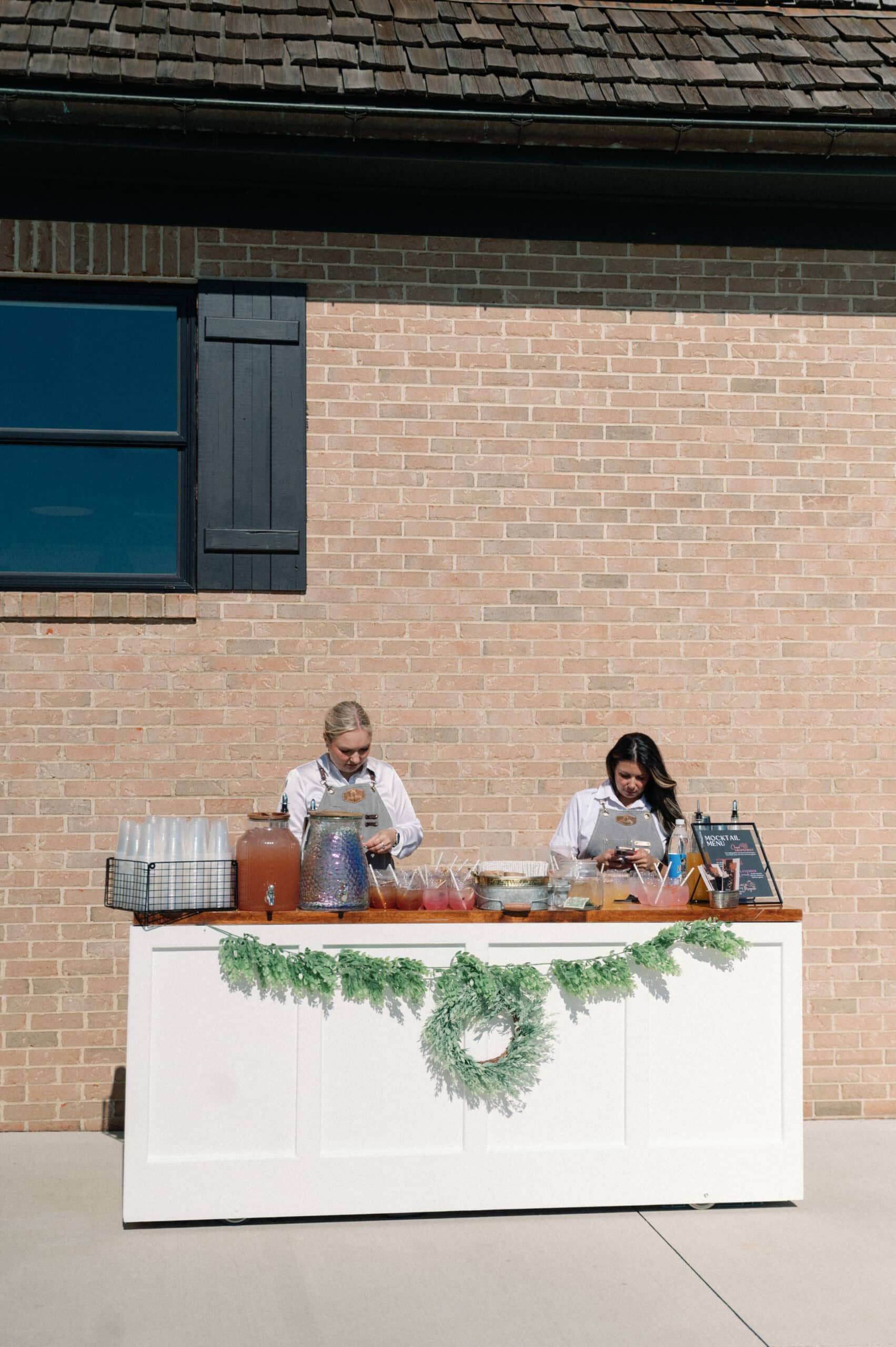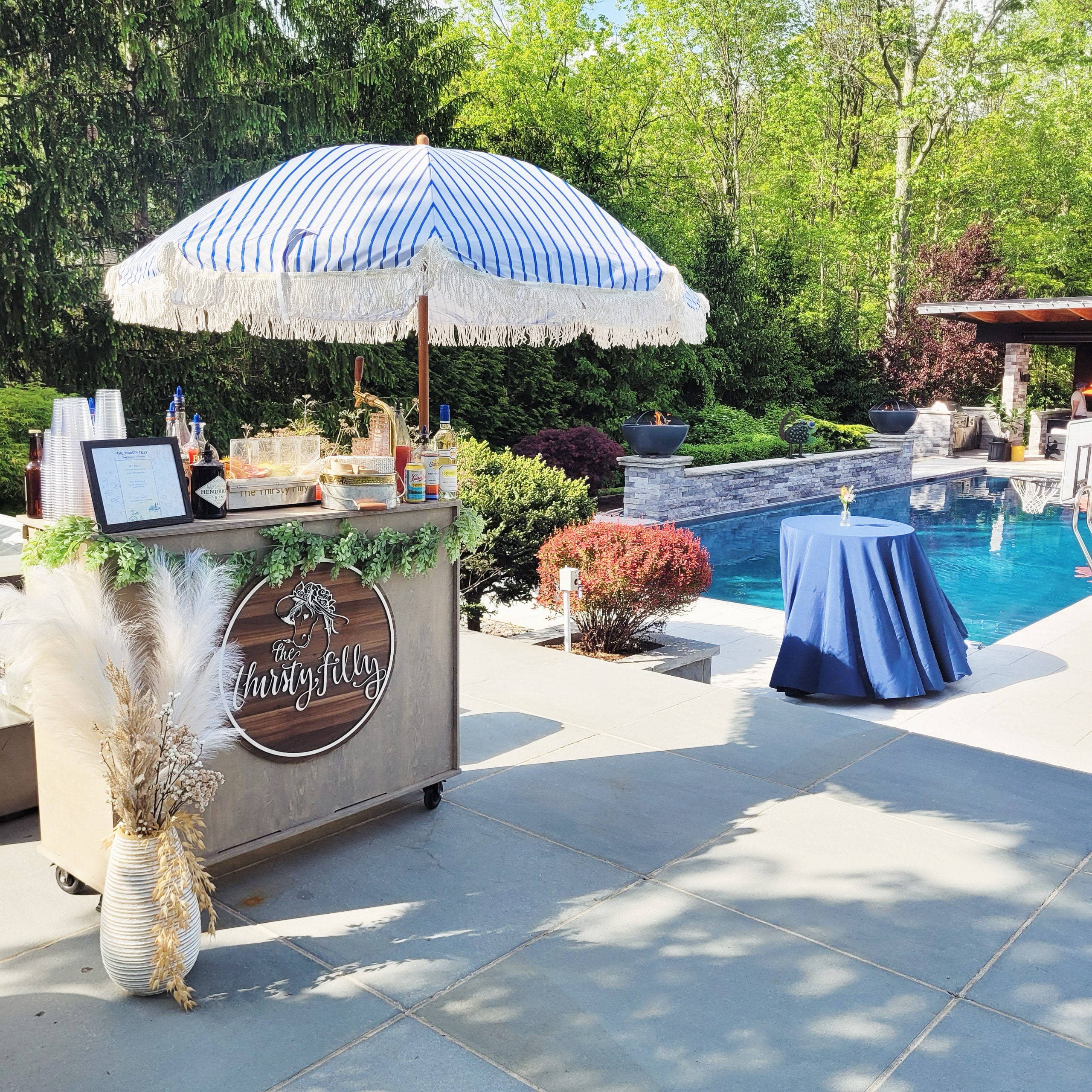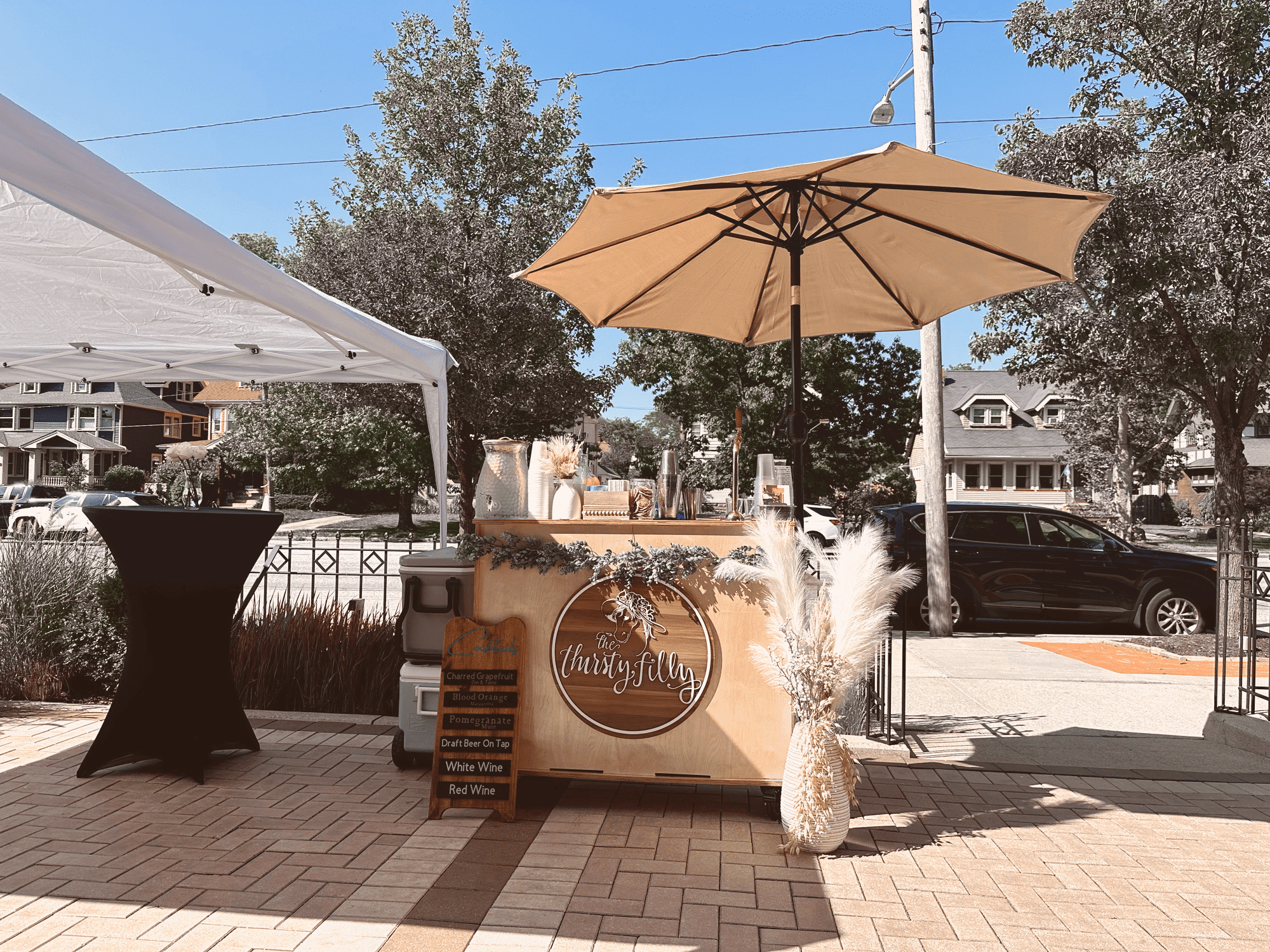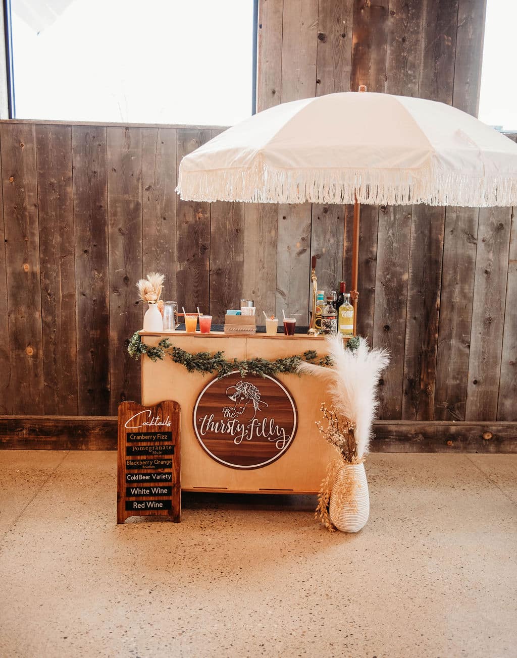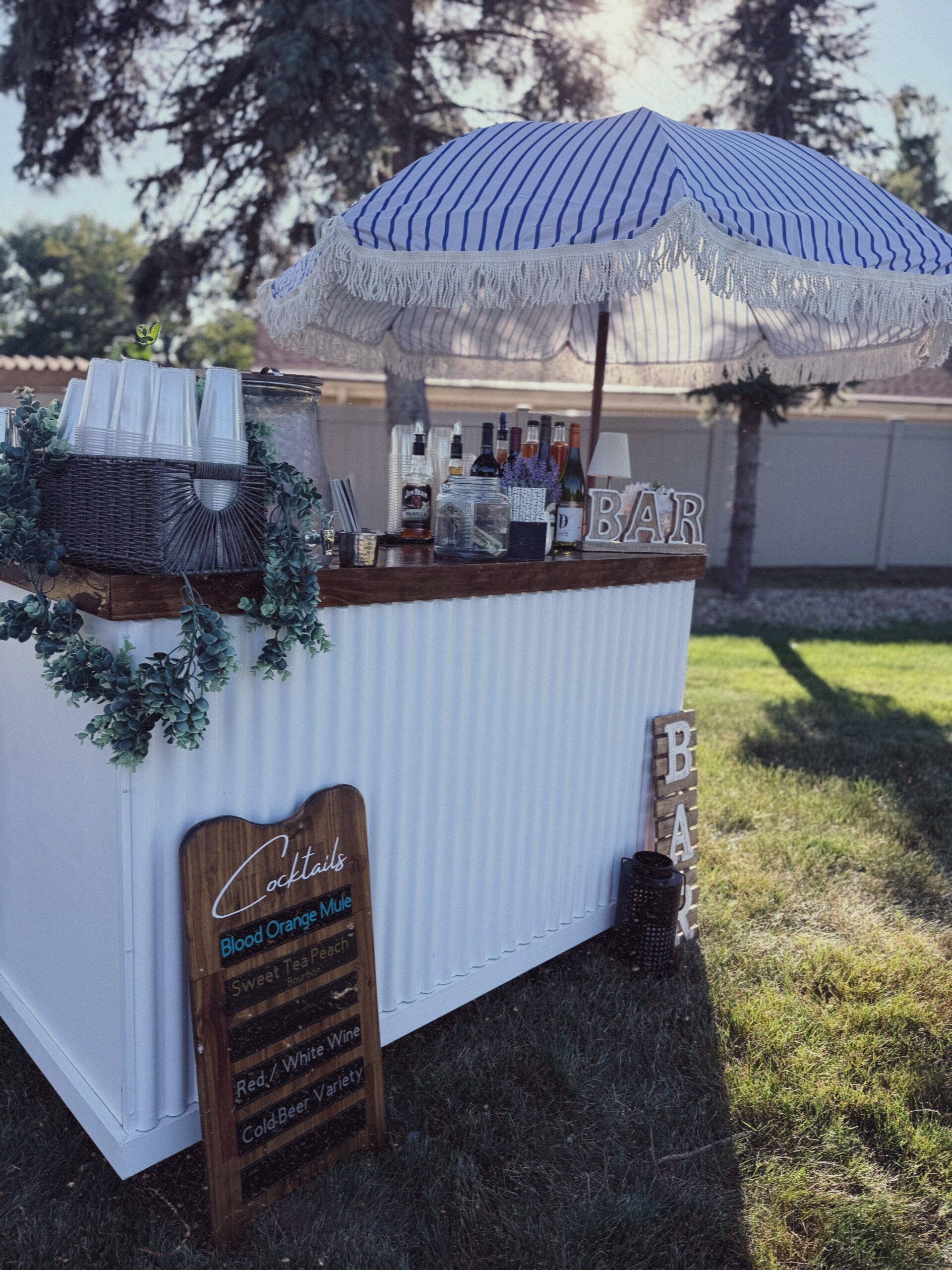 Our mini bar comes with fun decor and decorations as well as a bohemian umbrella. We also offer custom vinyl branding to display your company logo.