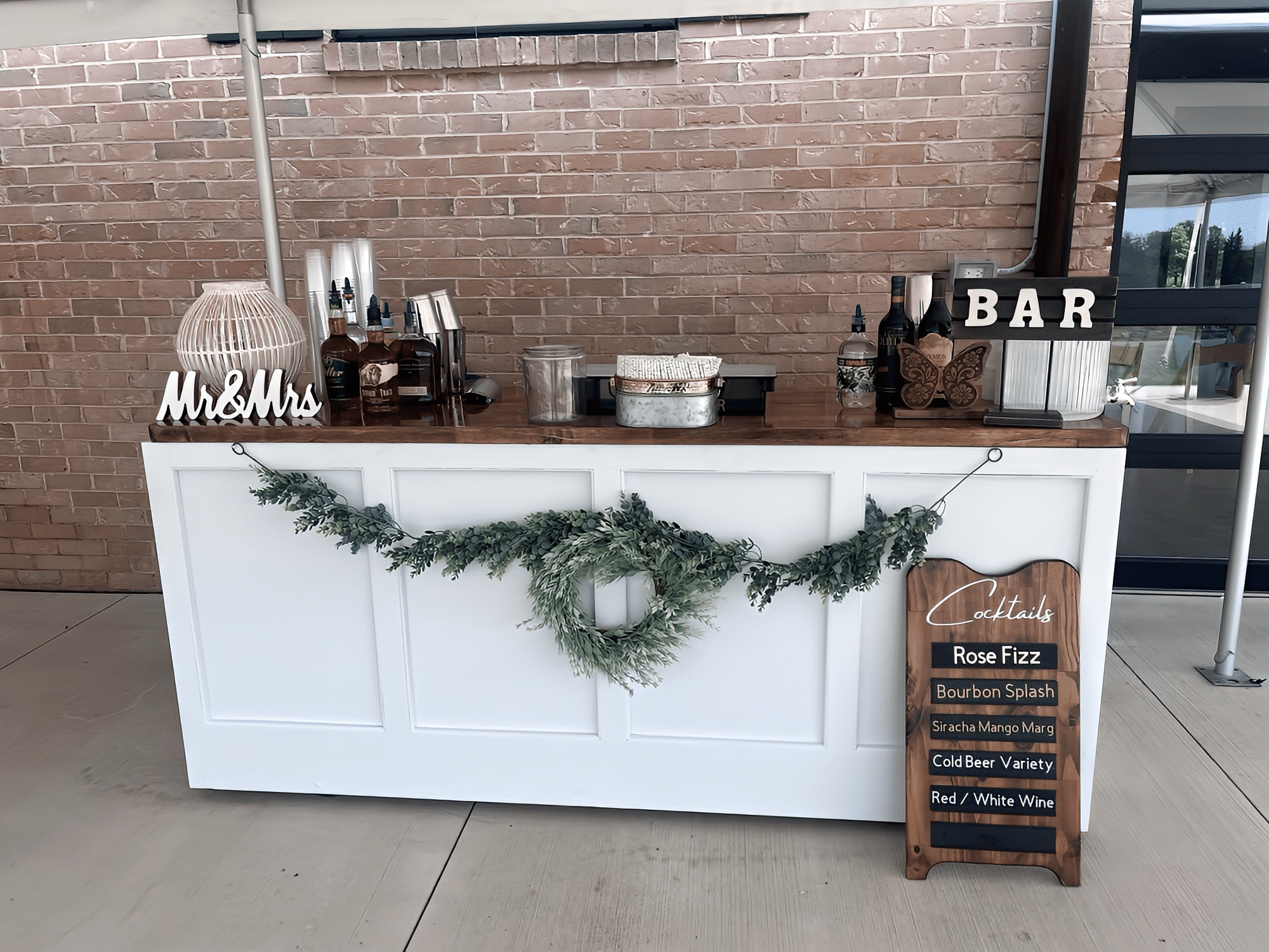 This bar comes with decor and decorations as pictured. All bookings also include chalkboard menu boards and water decanters.
